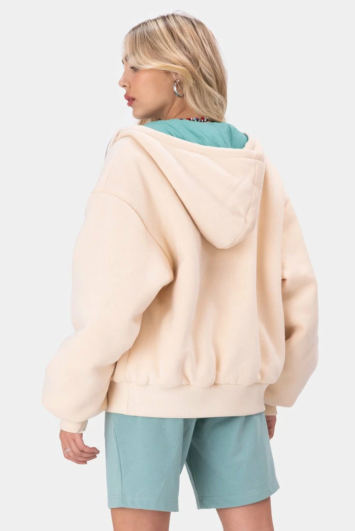 - Never a dull day, hun. Relaxed fit reverse puffer jacket in 2 colors with drawstring hood, side pockets, zip closure, and fitted cuffs and hem.