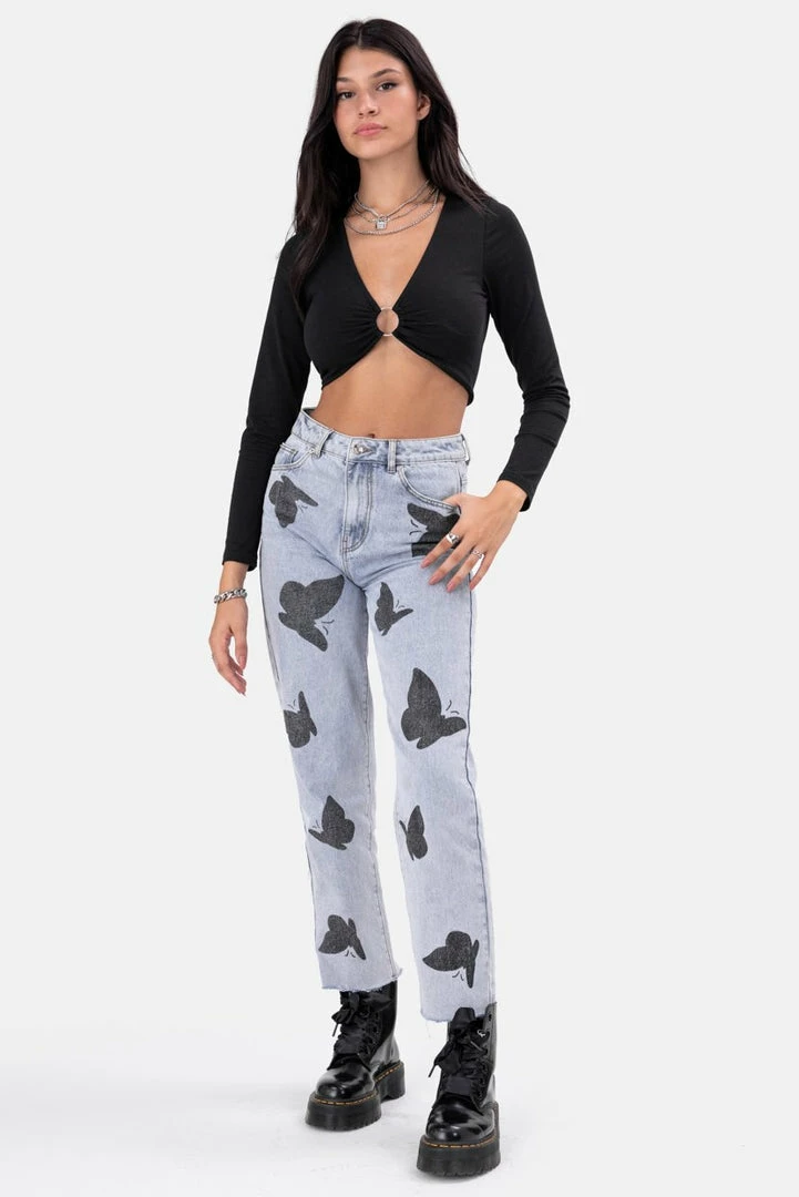 - Ring the alarm cuz this top is hella chic. Fitted cropped top in a t-shirt silhouette, featuring a deep v-neck with metallic ring detail, long sleeves and a dreamy open back with tie strings.
