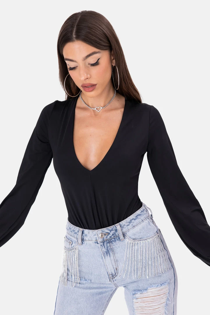 - Bod-ody-ody. Stretchy bodysuit with a deep v neck, long sleeves with elastic cuffs and hidden snap button closure