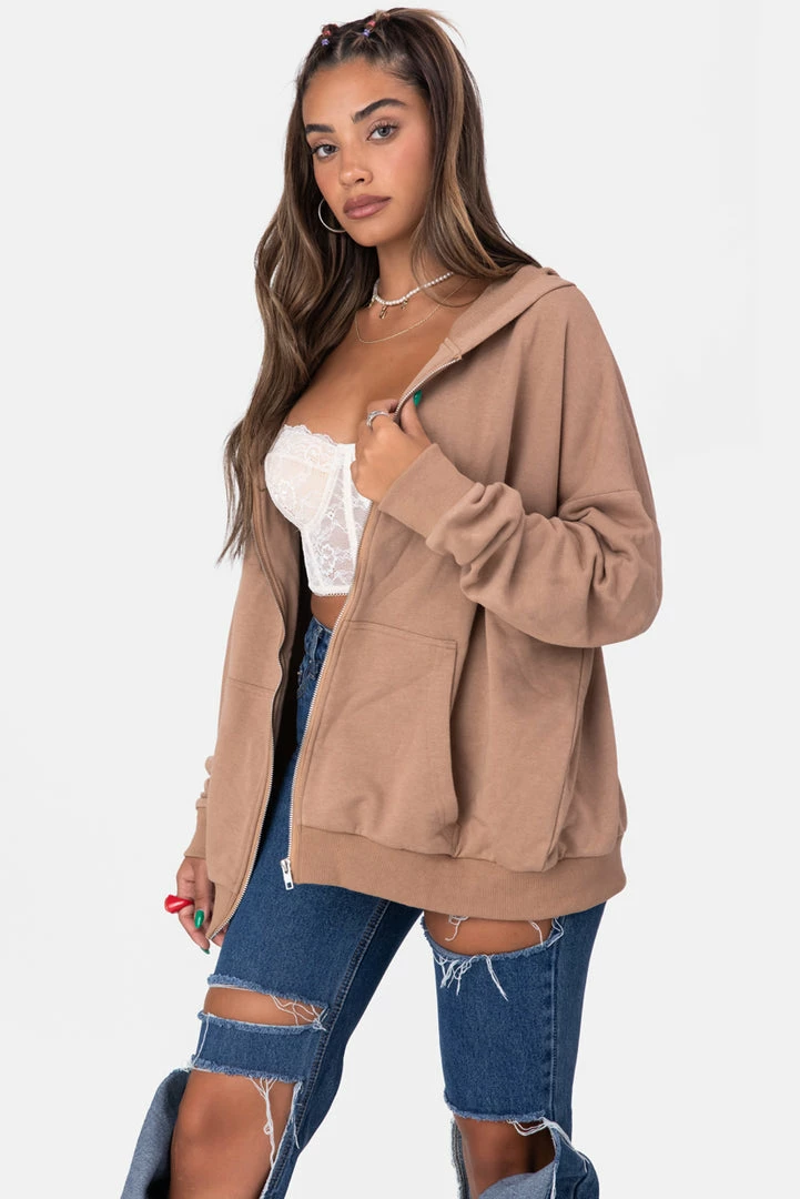 - Zip it. Oversized hoodie with zip closure, typographic print on the back, kangaroo pocket, dropped shoulder line and fitted cuffs.