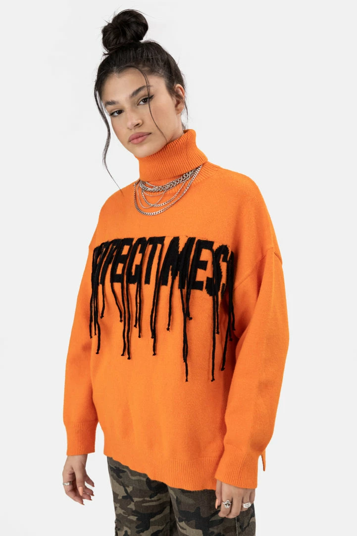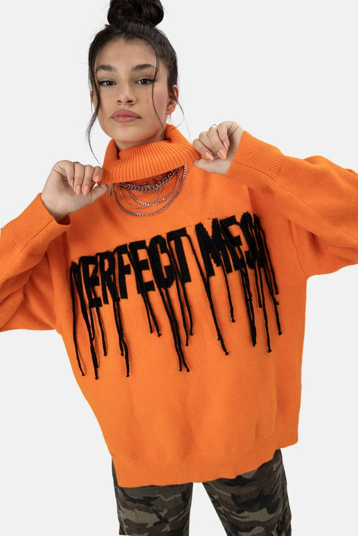 - A perfect mess is how we roll. Oversized knit sweater with a semi-undone woven-in graphic in the front, turtleneck and a ribbed outline.