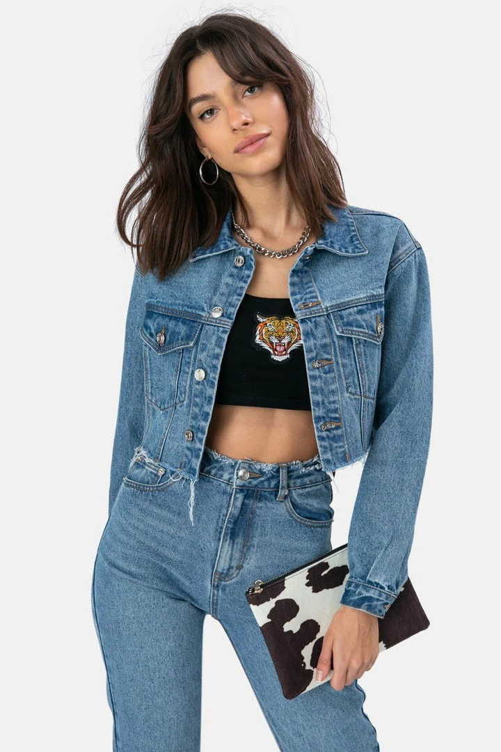 - Everyone knows Cropped & Denim are the perfect match. Denim jacket in a perf cropped fit featuring spread collar, button placket and raw-edge hem