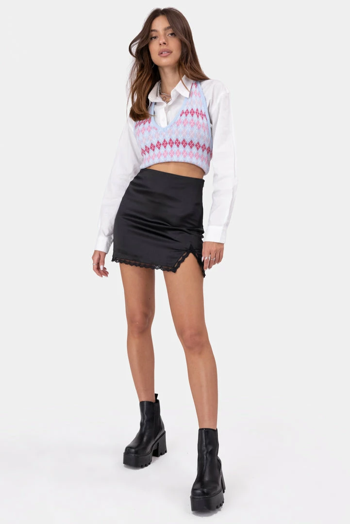 - Dress it up with an elegant top or keep it casual with a graphic tee and chunky boots. Satin finish mini skirt with a hidden side zip closure, inner lining, and a lace trim with a front slit for that sassy final touch.