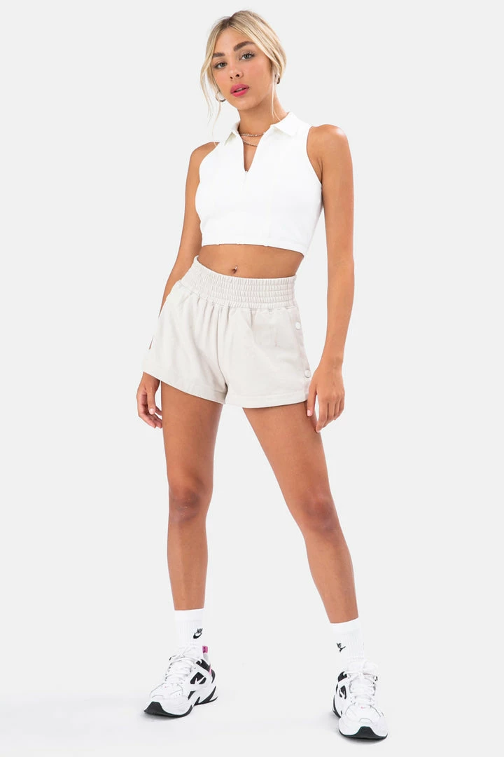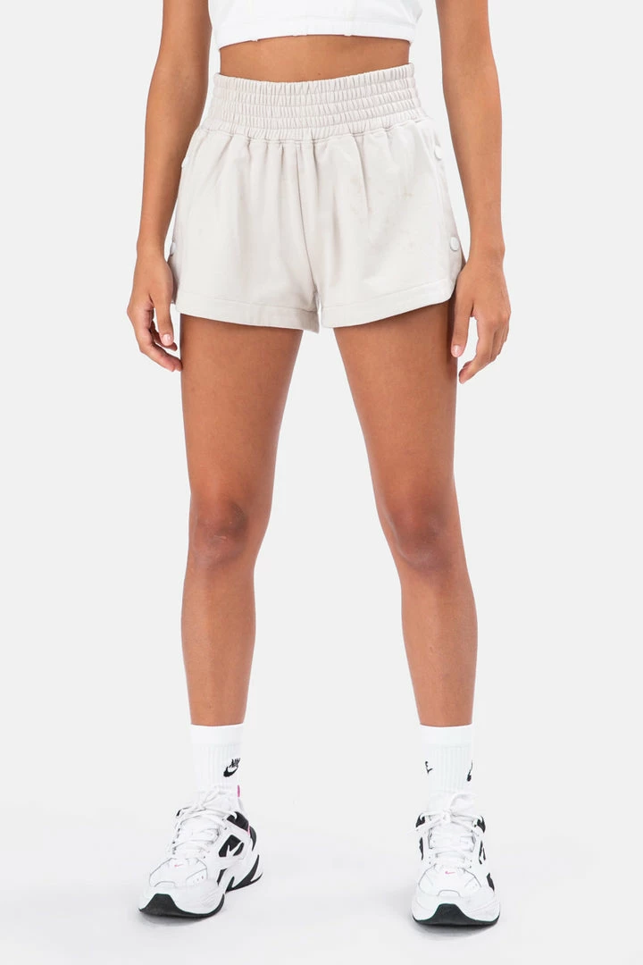 - C’mon champ, time to get workout ready. Super-short jersey shorts featuring wide elastic waistband and side slits with snap button closure. Take it and let’s keep moving.
