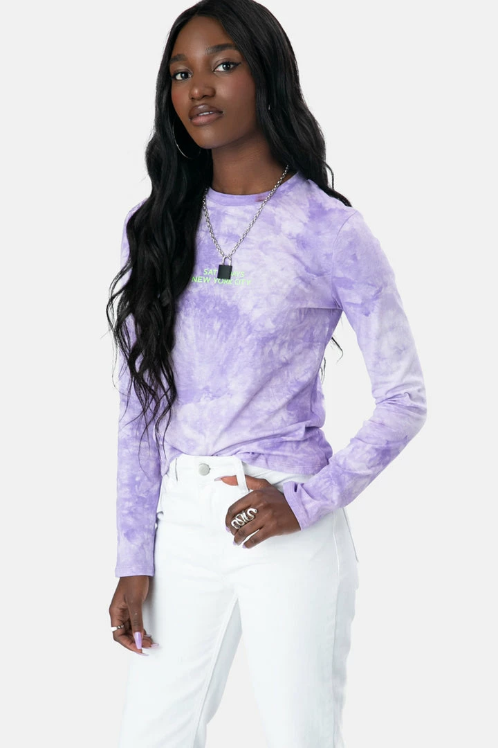 - Saturdays got us likeeee… Super chic long sleeve t-shirt in all-over tie-dye print featuring neon typography in front