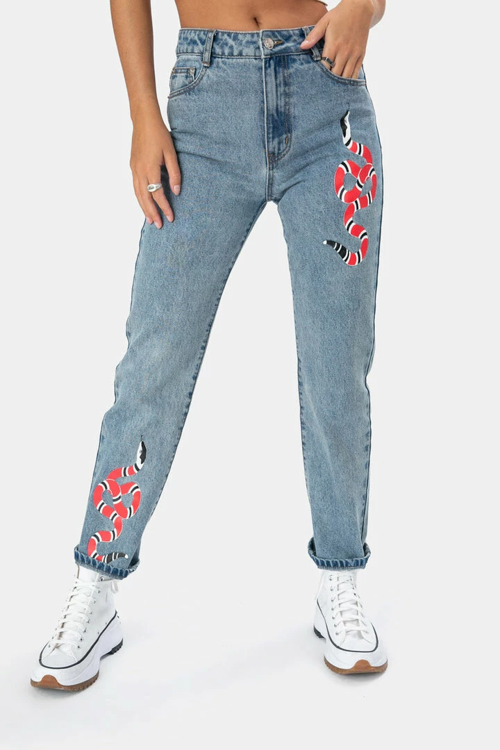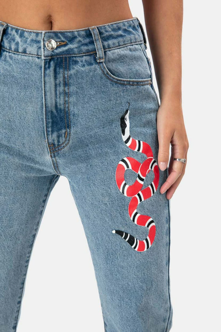 - SNAKE IT TIL YOU MAKE IT! High waisted jeans in a perf light wash featuring snake print detail in front and functional pockets
