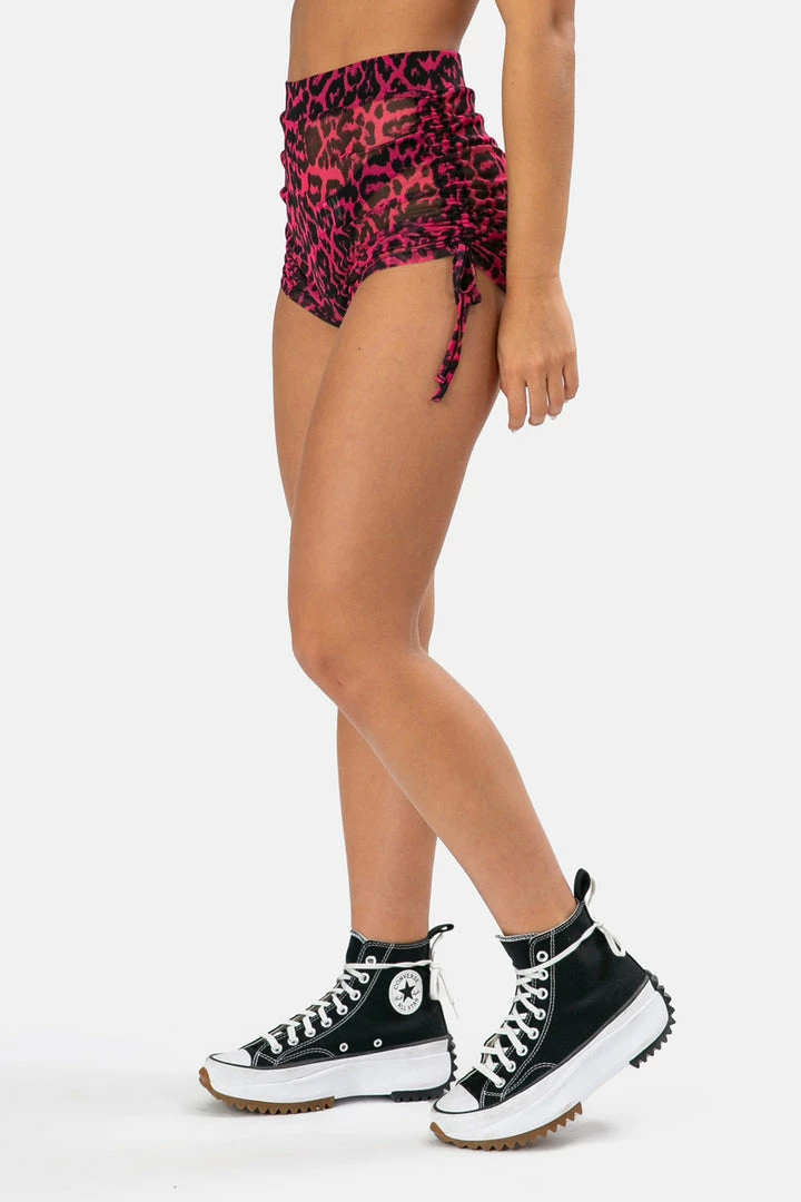 - Queen of the wild: high waisted shorts made of sheer material, featuring wild print and ruche detail on the sides.