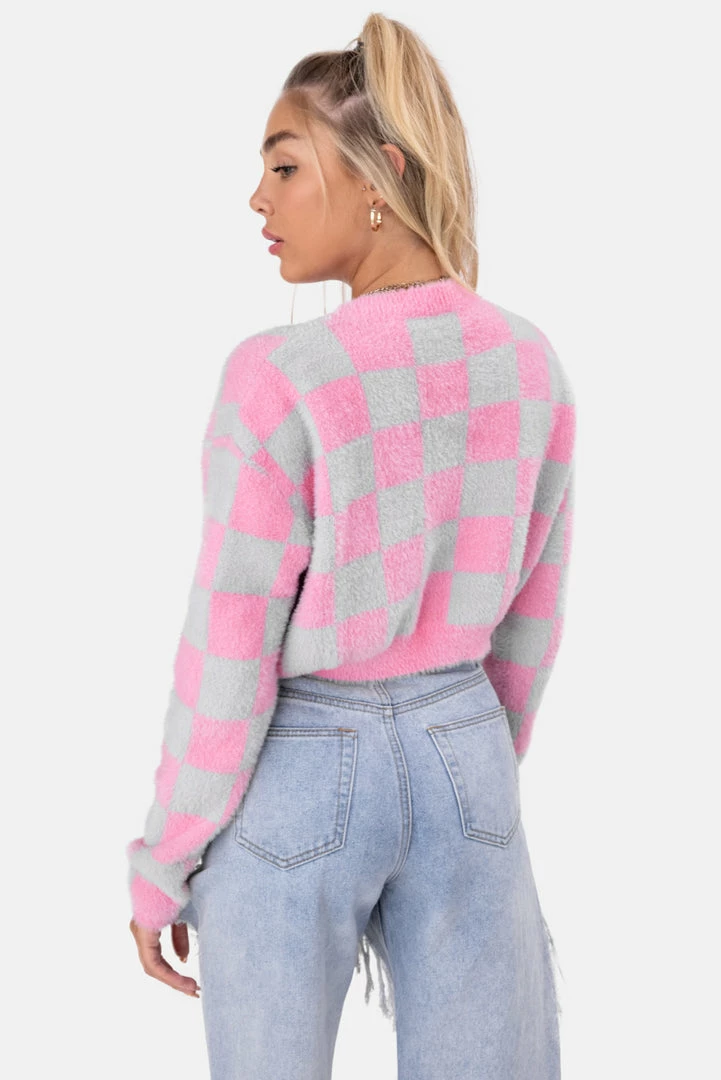 - All squared up and lovin’ it. Super-comfy cropped faux fur sweater in a colorful checkered print.