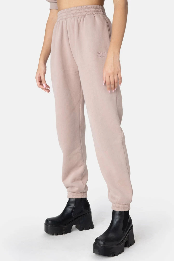 - Comfy swag is life. Relaxed and warm sweatpants in a high waisted fit with embroidery in the front, an elastic waistband, side pockets and fitted cuffs.
