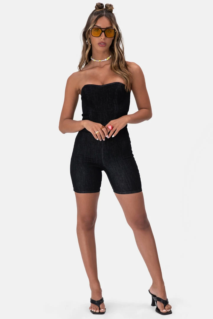 - Boss-level style move. Bodycon, strapless romper in stretchy denim with back zip closure and biker fit shorts.