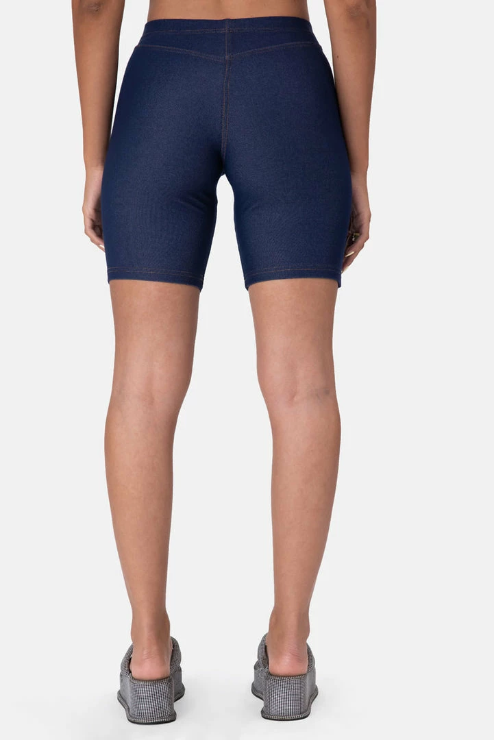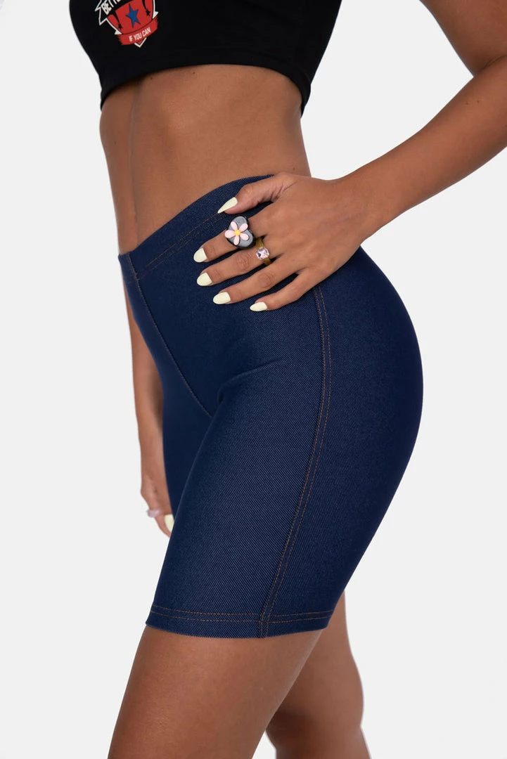 - All denim everything, tnx. Stretchy biker fit shorts in denim print all-over with an elastic waistband and stitch detailing.