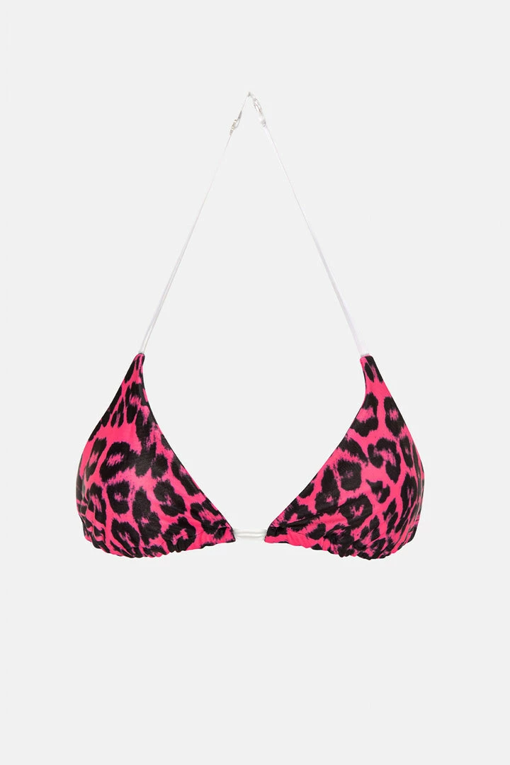 - THIS is where the wild things are! Triangle bikini top featuring wild leopard print, clear, adjustable straps and an inner lining to add opaqueness.