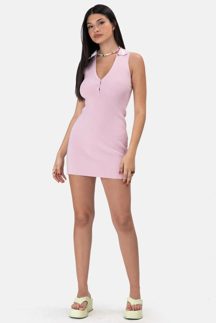 - Serve it up. Stretchy knit mini dress featuring polo-style collar with contrast stripe detail, deep V neck with a snap button placket and low arm cut.