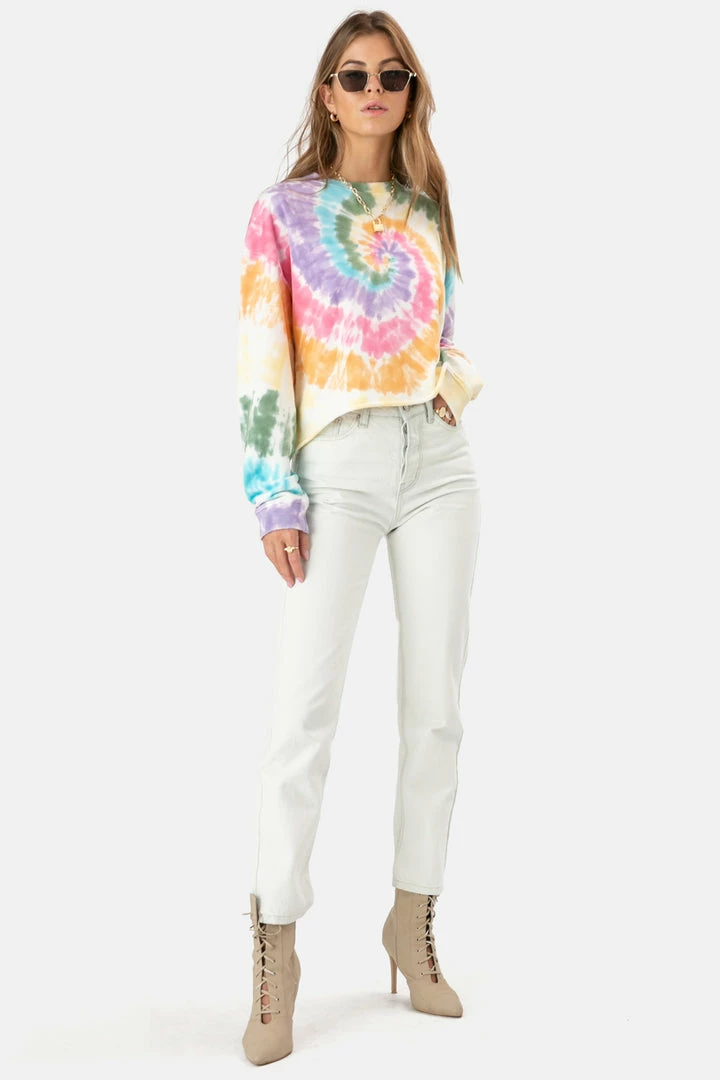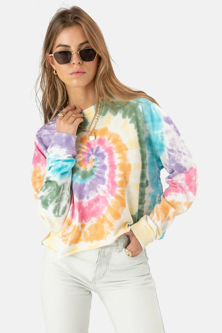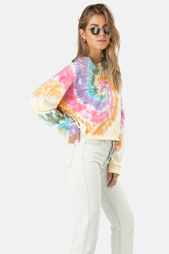 - Big rainbow energy, RH. This cropped sweatshirt comes in super-colorful tie-dye all-over, ribbed collar and cuffs and raw-edge hem. So groovy, and so yours.