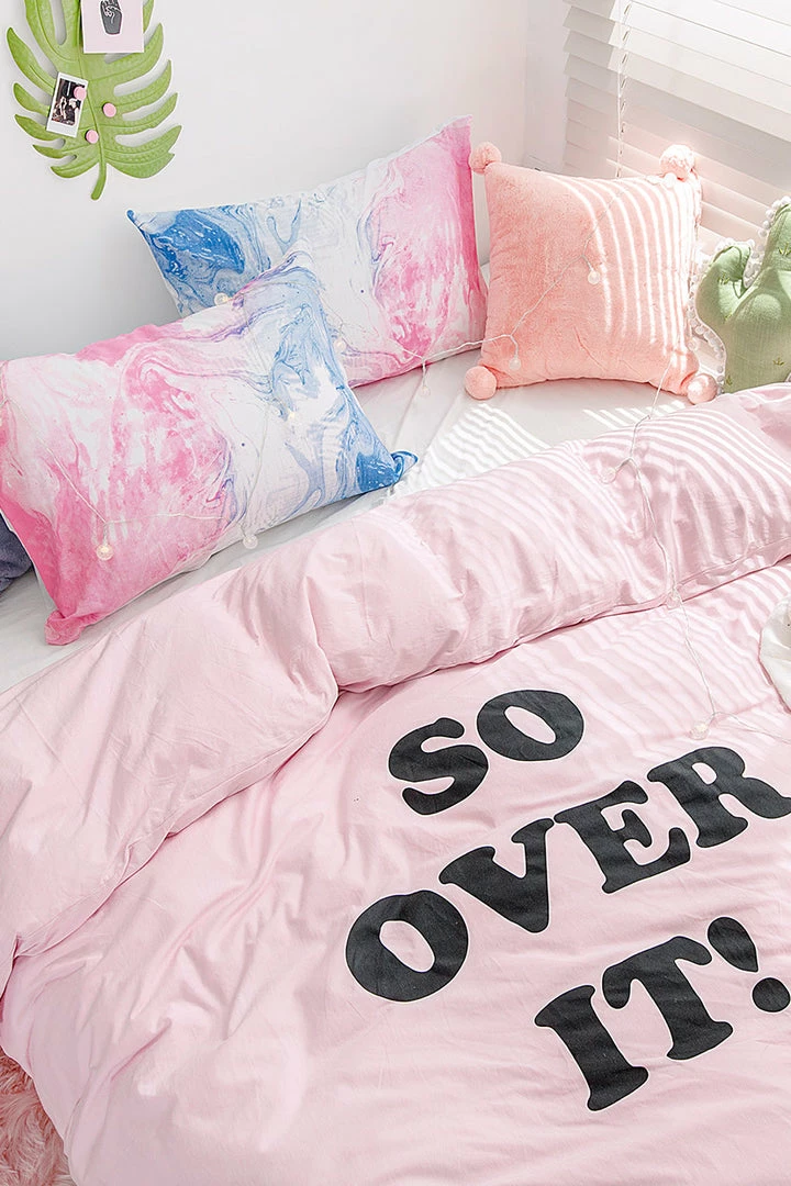 - Twin size organic cotton jersey bed comforter set that includes pair of marble-printed pillowcases & duvet cover with sick typographic print that says it all! Set comes in a useful, compact drawstring storage bag