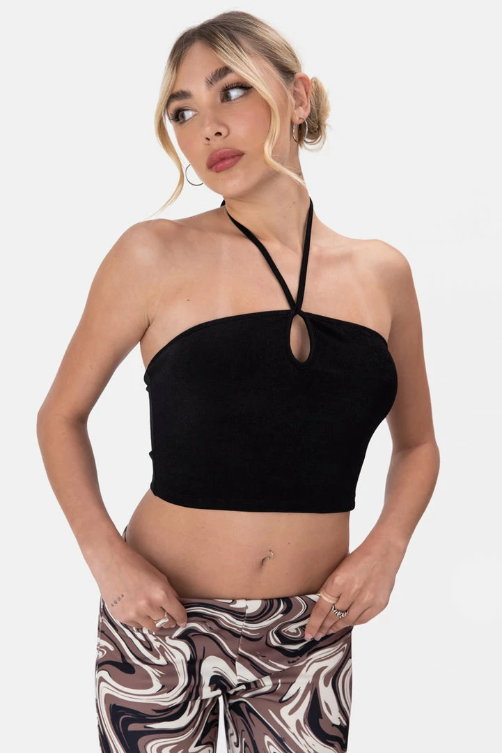 - Ready to tie the knot. Cropped, stretchy halter top with an open back, front keyhole and tie strings around the neck.
