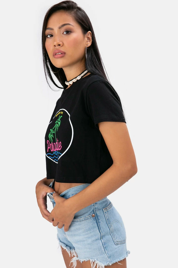 - Take me to paradise, please! Cropped tee with raw-cut hem and dreamy graphic print in front.