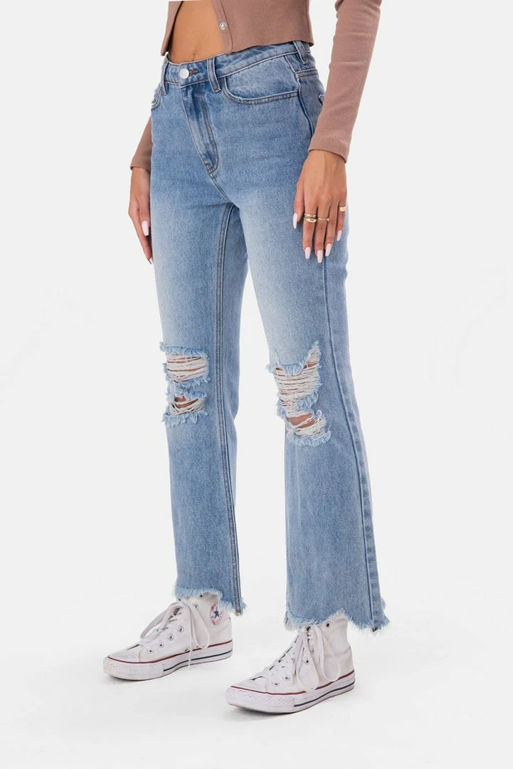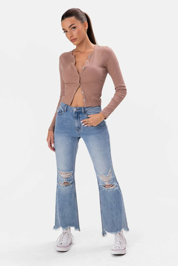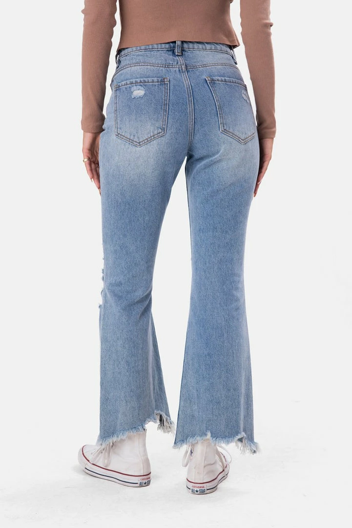 - Ripping and shredding it. High waisted flared jeans with distressed detail all-over, button and zip closure, 5 pocket design, belt loops and cropped, fringed, bell bottom.