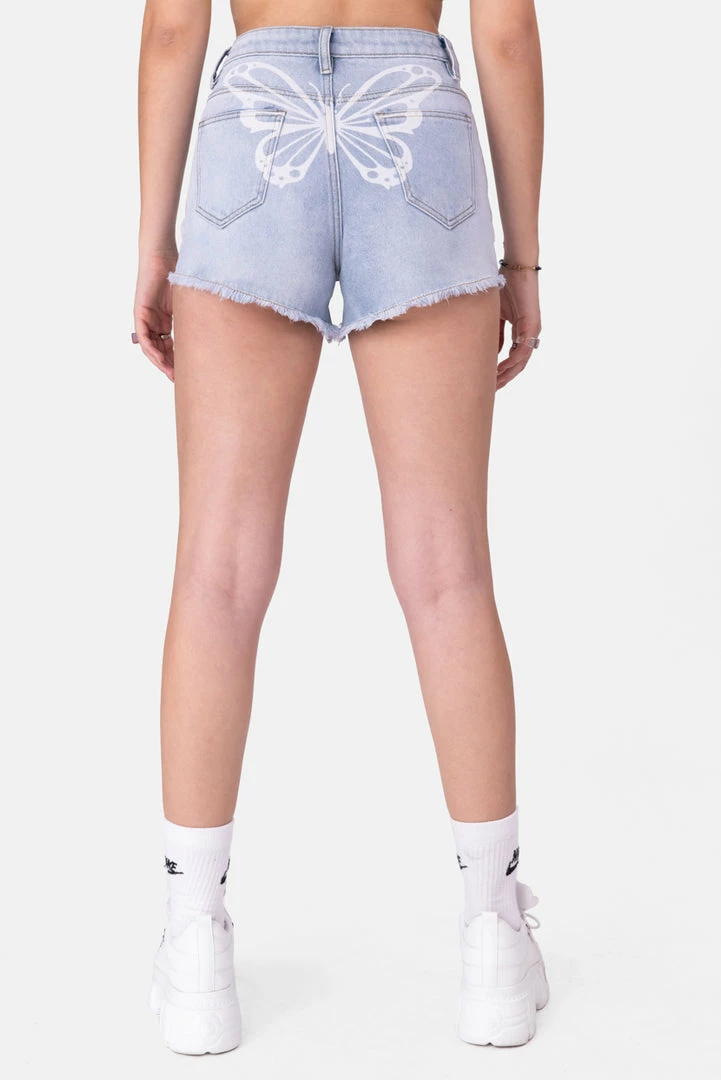 - Supa dupa fly. Mid-rise denim shorts in a light wash with graphic print on the back, zip and button closure, belt loops, 5-pocket design and a frayed hem.
