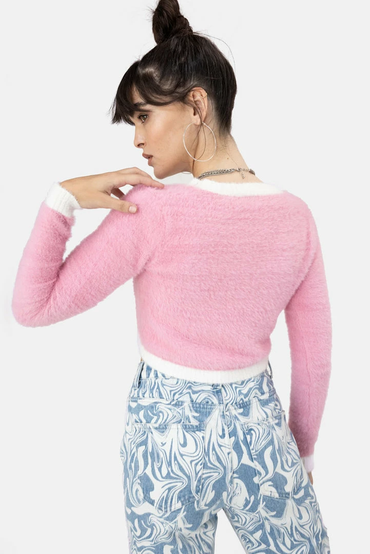 - Regina George made us do it. Cropped cardigan in a mega-addictive fuzzy-knit with button closure, v neckline and a stylish contrasting outline. CHIC.