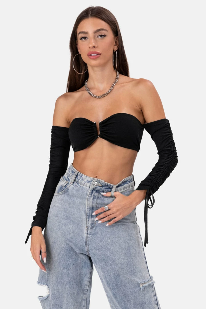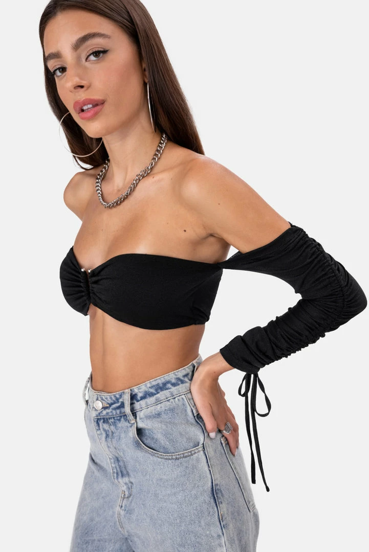- Current mood: Posh Spice! Bandeau style off-shoulder top in a stretchy fabric with U shape ring detail and long ruched sleeves with tie string cuffs.