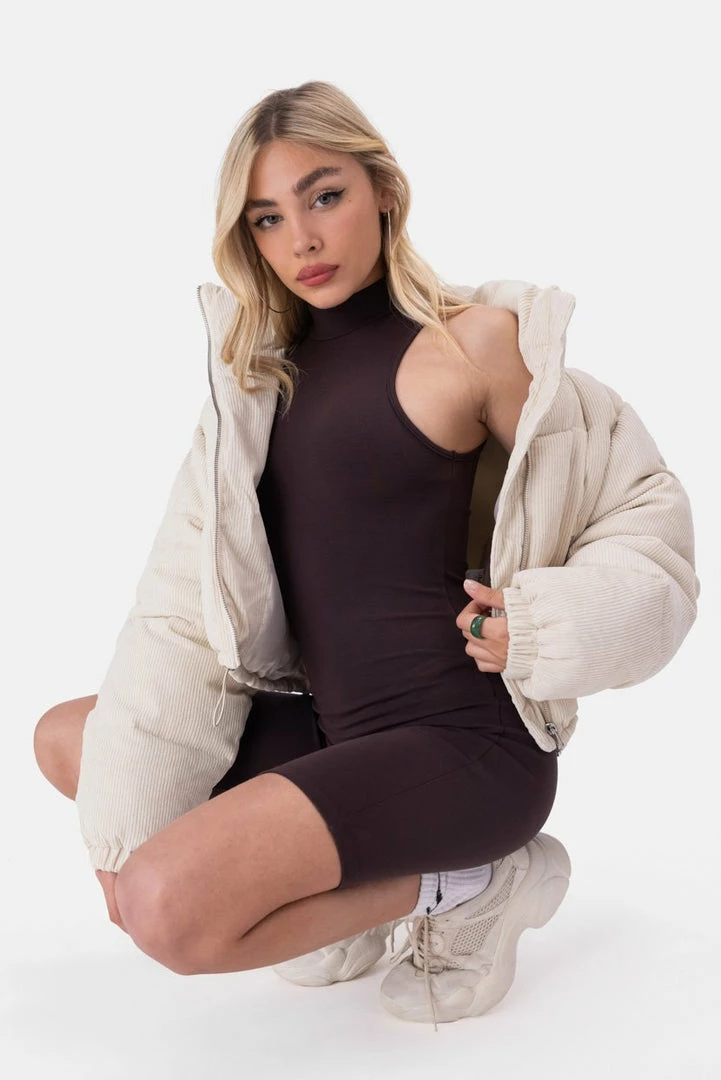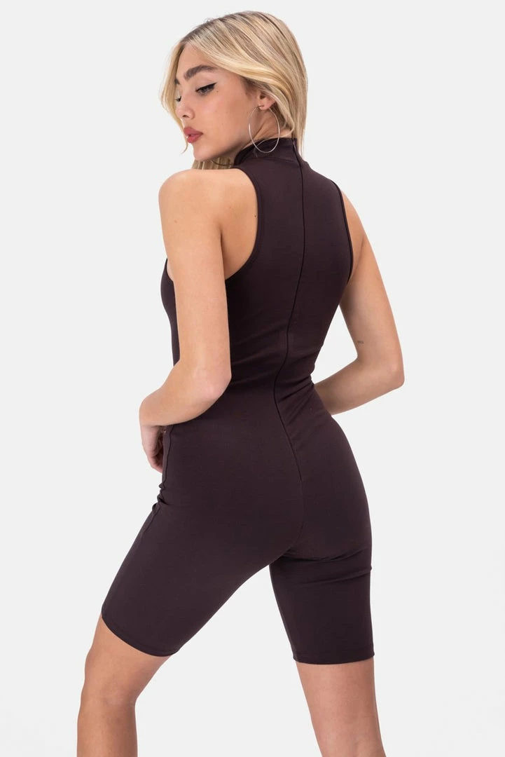 - Lookin’ fly, bb! Bodycon, stretchy, sleeveless jumpsuit featuring above-the-knee shorts, a high collar, back zip closure and low arm cut.