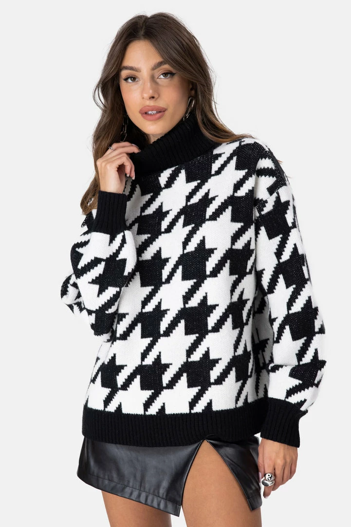 - Caution, this fit is addictive. Relaxed knit sweater in an all-over houndstooth pattern with a turtleneck and a ribbed outline. You’ve been warned.