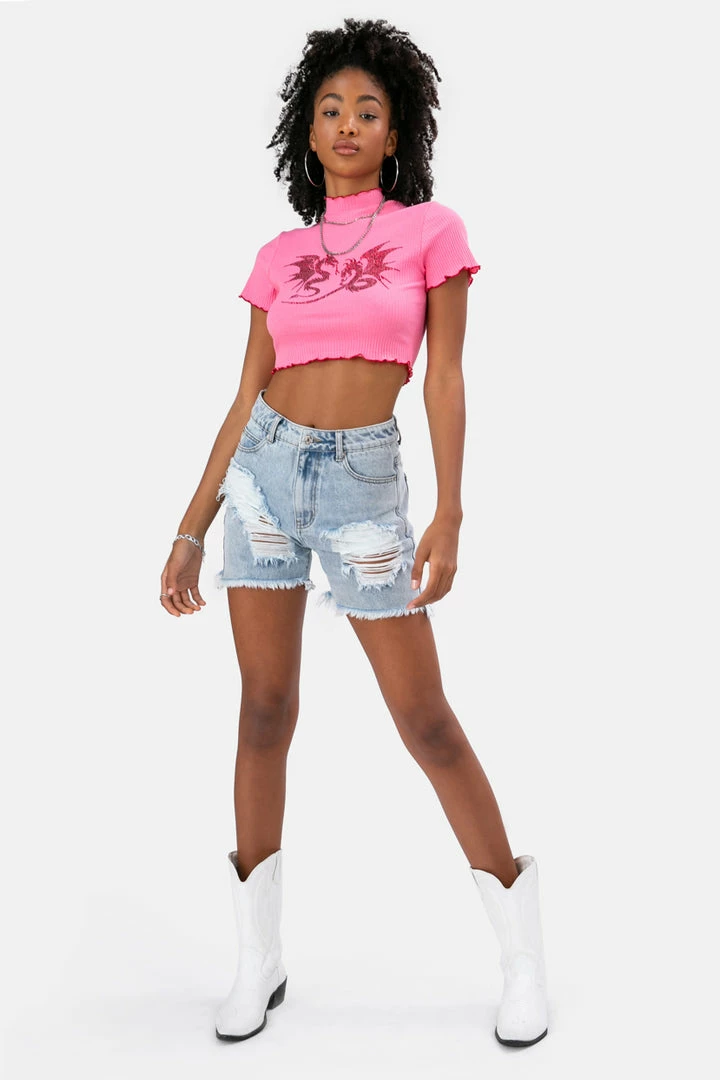 - HOT! Cropped ribbed tee, with rhinestone detail and graphic print in front, wavy hem, and mock turtleneck.