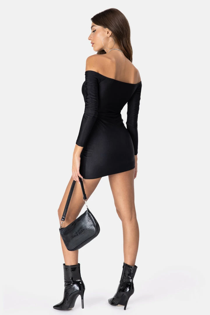 - 100% about to feel yo’self. Stretchy, bodycon fit, mini dress with all over ruched detailing, a cut-out just below the chest and long sleeves.