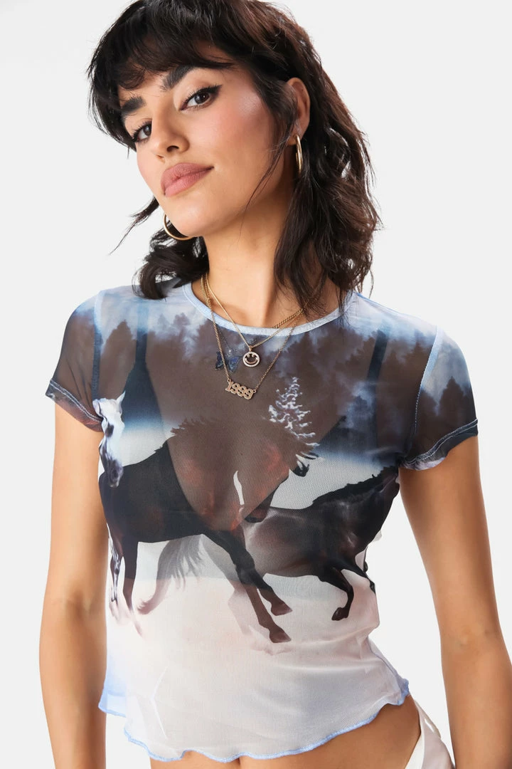 - Horsing around. Cropped T-shirt in mesh with all-over wild graphic featuring a round neck, short sleeves and curly hem.