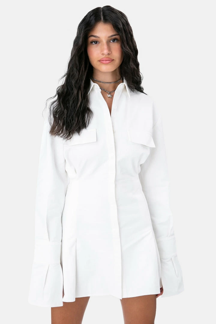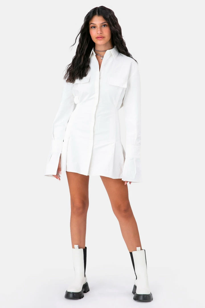 - When youโre in the mood for a tailored yet casual look. This shirt dress comes fitted in the waistline with super-elegant side pleats and button-down closure. Including classic collar, flap details in the chest, mega-chic bell-shaped cuffs with buttons and slit detailing. So poetic and rad!