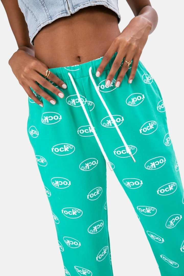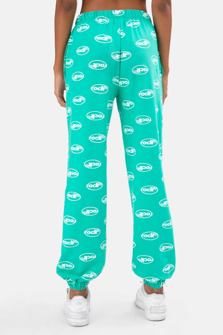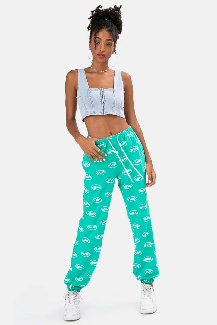 - 90’s vibes to the max! Jersey sweatpants with all-over printed typography, elastic waistband with drawstring, fitted cuffs and side pockets. Rock on, girl.