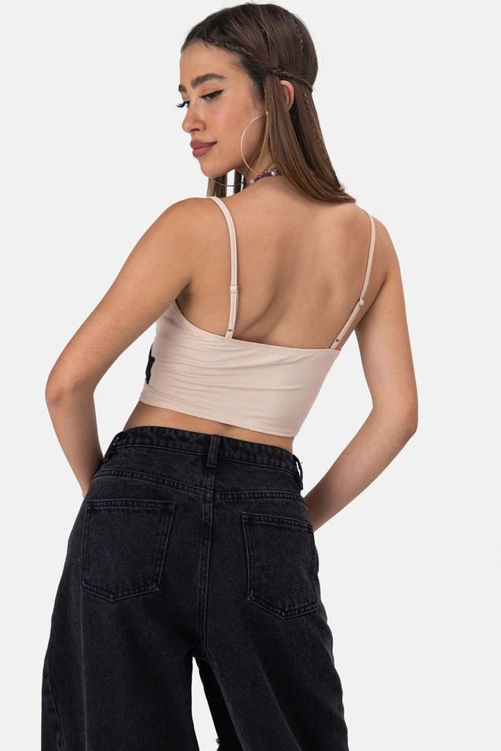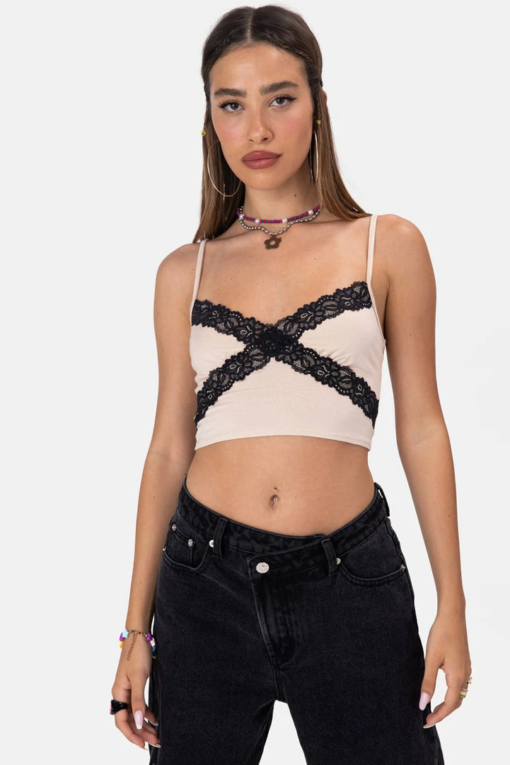 - Lace do this. Cropped cami top with lace detail on the front, adjustable spaghetti straps and sweetheart neckline.