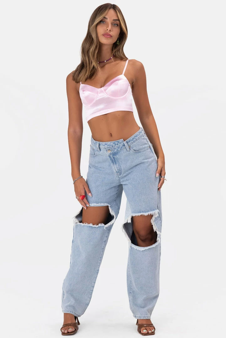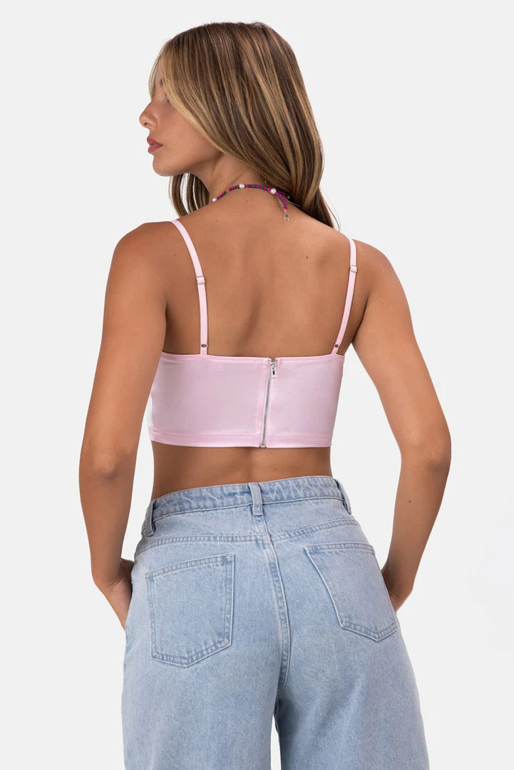- When you wanna feel straight fire. Super cropped top in stretchy satin finish fabric with adjustable stretchy spaghetti straps. Zip closure in the back, sweetheart neckline with cup detail in the front and corset bones for extra support. Hot and so yours.
