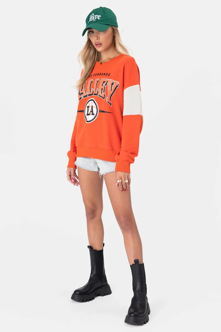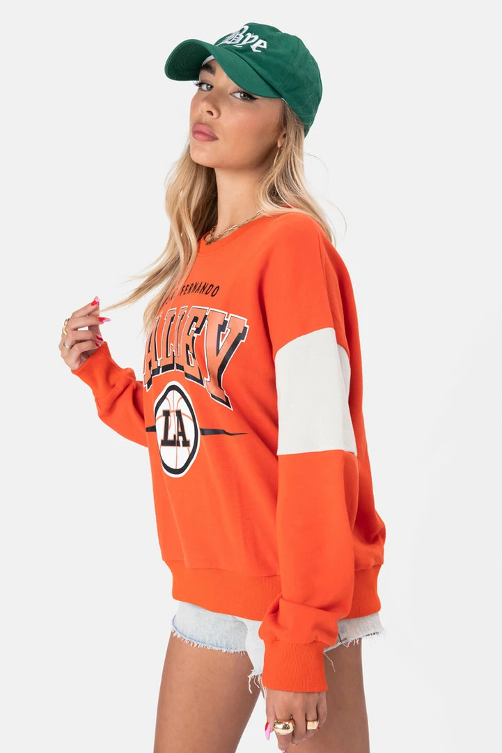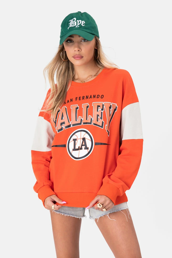 - Find me in the valley. Oversized, lightweight sweatshirt with graphic print on the front, long sleeves with color-block detail, crewneck and ribbed, fitted, outline.