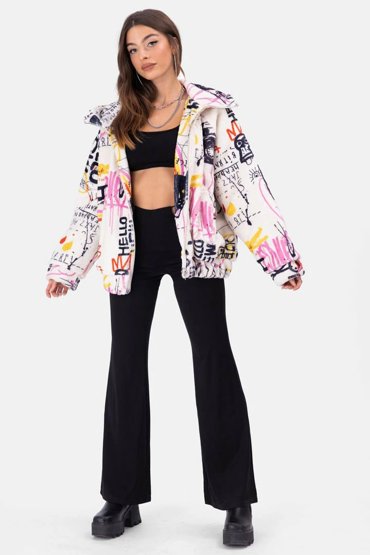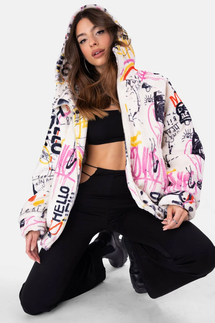 Promo 👏 Adika Scribs Graffiti Faux Fur Jacket 🤩