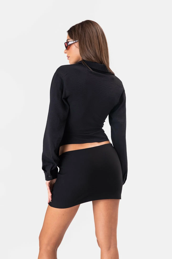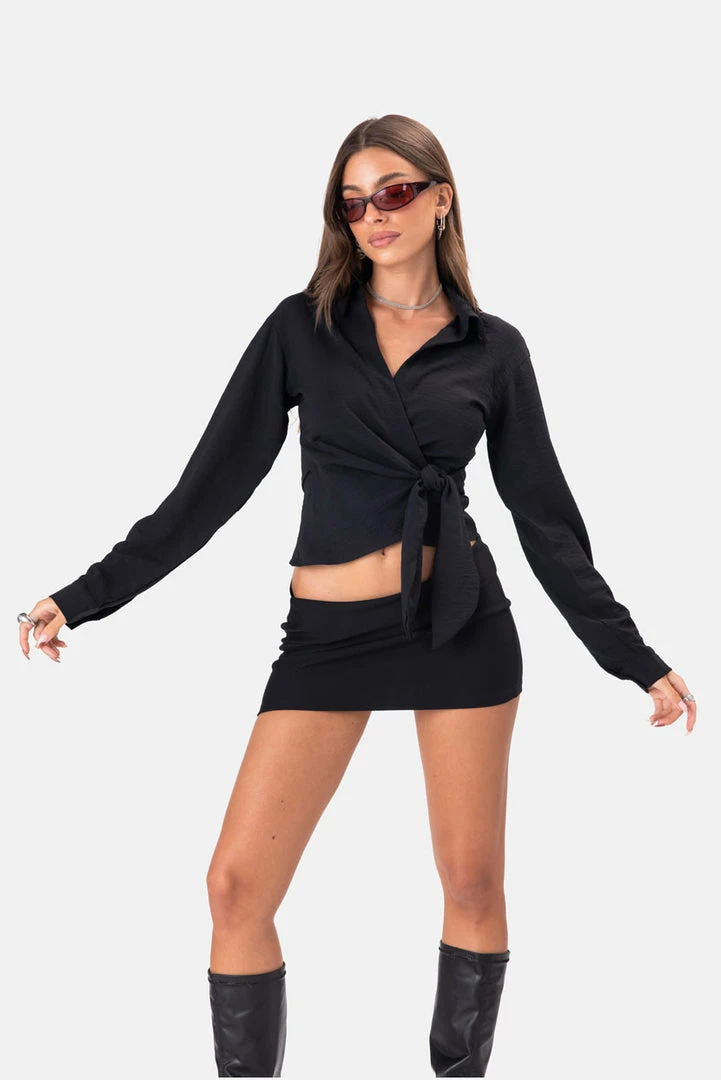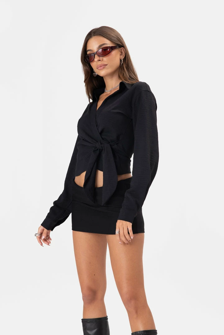 - Itโs giving bossgirl vibes. Wrap top in crinkled fabric with wide tie straps, classic collar and long sleeves with button cuffs.