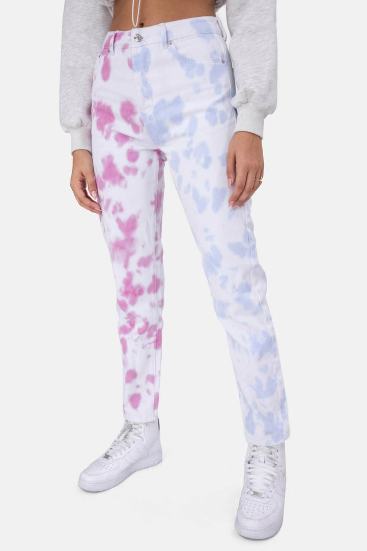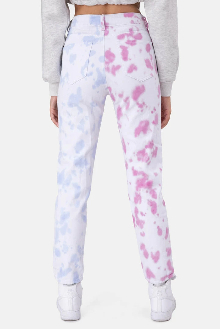 - The only kinda shade you’ll be getting with these is your friends constantly asking, “but where did you buy these from?” Mom fit jeans with all-over tie-dye print in color block style, classic button and zip closure, front round pockets, back patch pockets and belt loops.