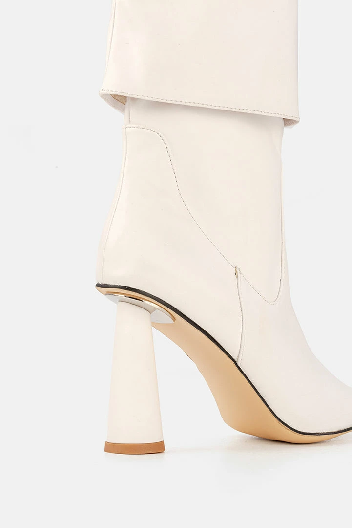 - The โ60s called. Super chic knee-height, faux leather boots in retro style design with inner zip closure, mid-high heel and pointy toe.
