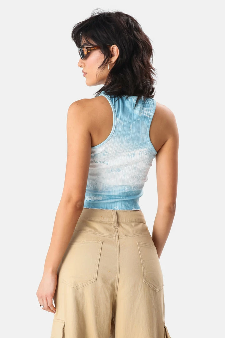 - Read all about it. Racer top with mega-chic all-over print with crewneck and wavy hem.