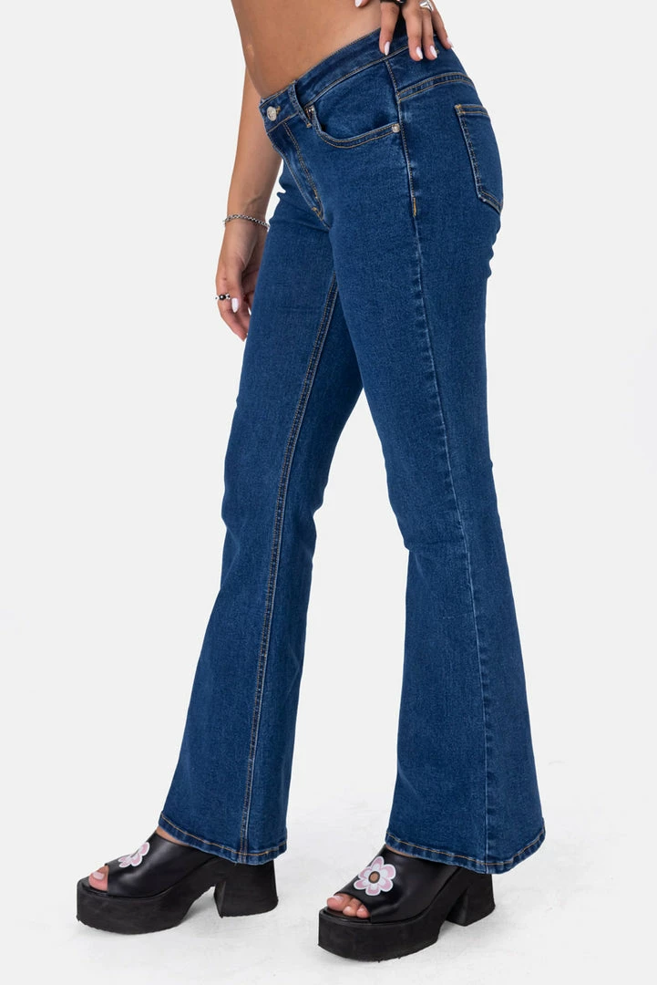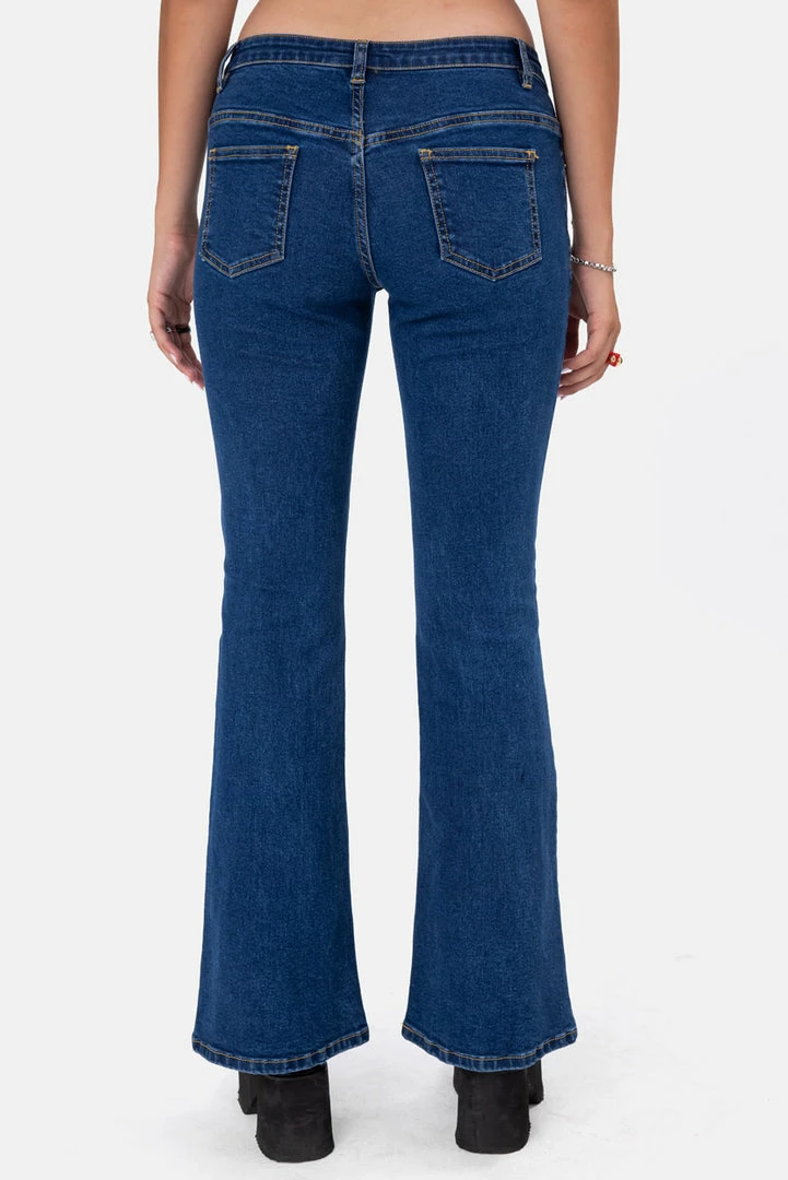 - Y2K, represent. Dark wash jeans in a low-rise fit featuring bell-bottom, button and zip closure, 5-pocket design and belt loops.