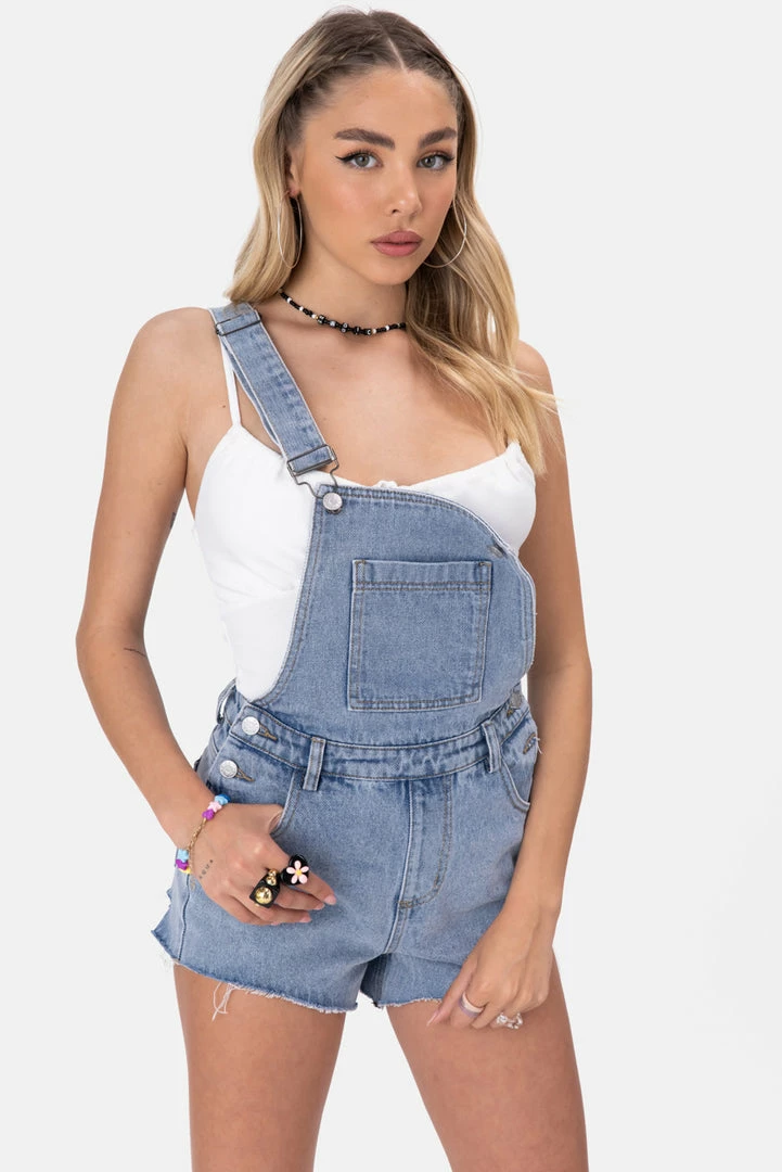 - Call me a denim addict, idc. Classic denim overalls in a short fit with side button closure, adjustable shoulder straps, belt loops and raw-cut hem. Including a distressed detail in the back, center chest patch pocket, front round pockets and back patch pockets.