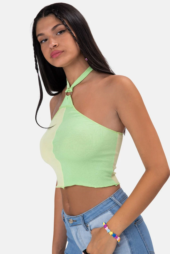 - Serious summer feels. Ribbed halter top in color block design with reverse stitching detail and wide tie strings with metallic ring detail.