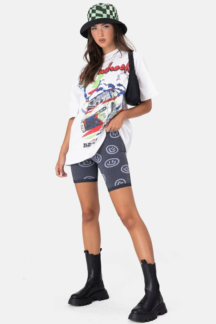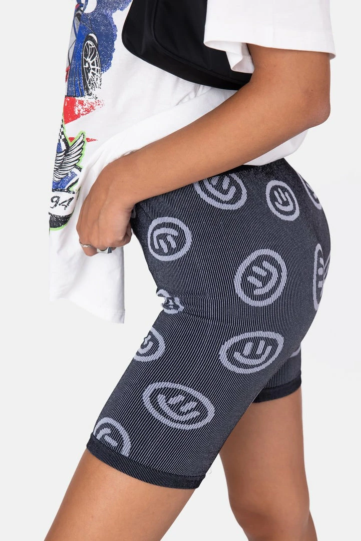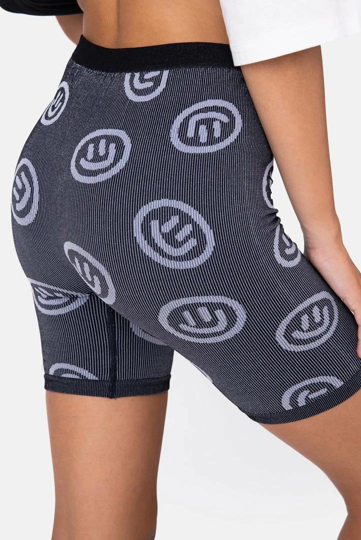 - Smile at the camera. Seamless rib knit shorts in smiley print all-over and an above-the-knee fit with an elastic waistband.