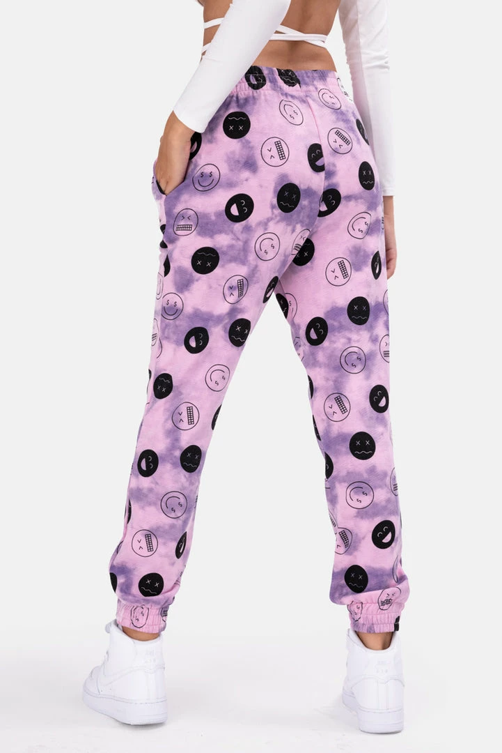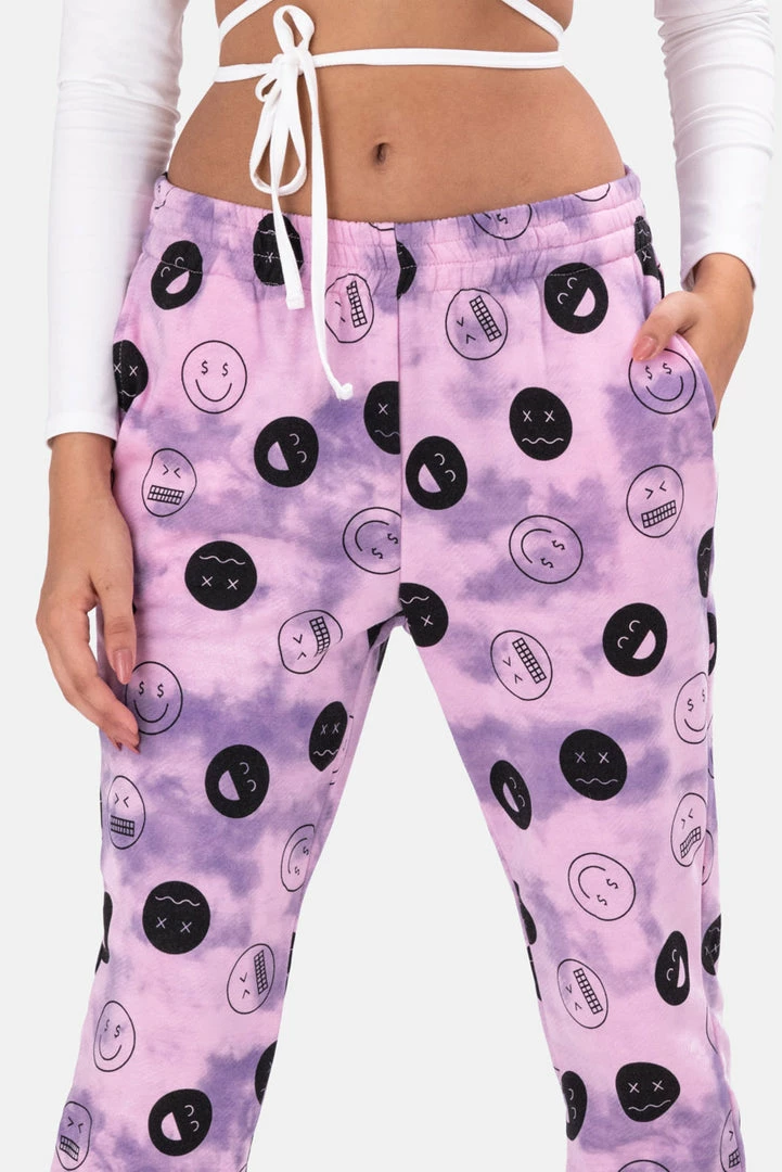 - Yep, we totally did a thing. Super-vibrant tie-dye sweatpants with mega-fun smiley print all-over, side pockets, elastic waistband and hem. Show ’em who’s boss and take it!