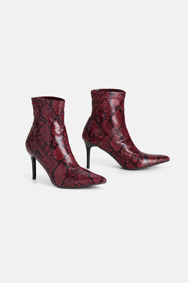 - Hiss at ’em, every step you take. These dreamy booties come in stretchy snake-textured faux leather with a stiletto heel and a pointy toe. Bite it bby.