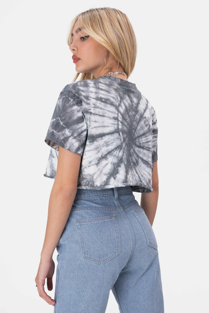 - And all things hella nice. Loose and cropped fit, t-shirt in all-over tie-dye featuring a graphic print on the front, short sleeves, crewneck and raw-cut hem.