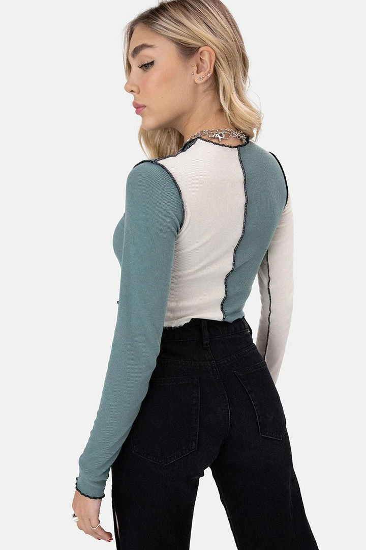 - Meet your new other half! Top wise that is. Cropped and ribbed long sleeve t-shirt in the mega-trendy color-block design with a wavey outline. De nada, grl.