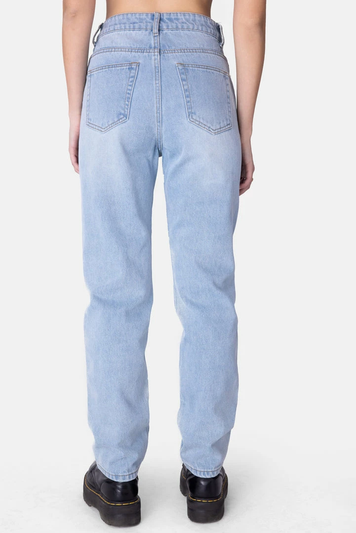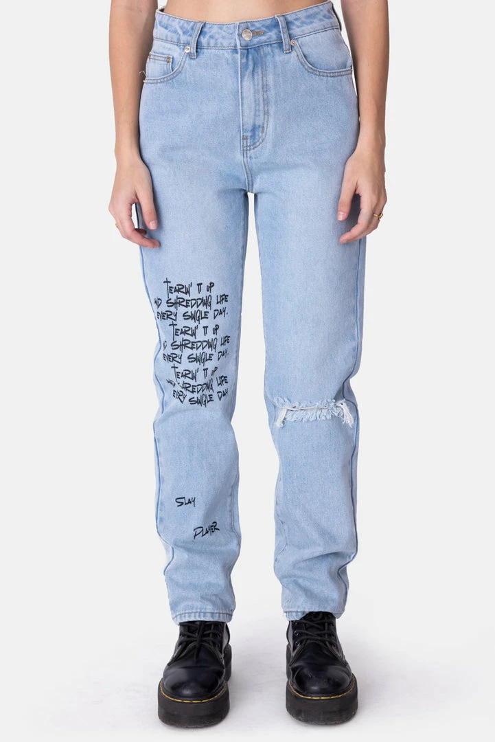 - Not a player, a slayer. High waisted, mom fit jeans with a graphic print on the front, distressed detail in the knee, button and zip closure, belt loops and a 5 pocket design.