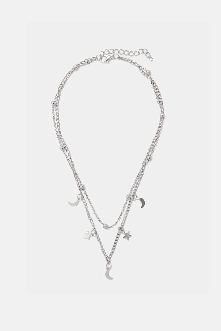 - Stary, stary style. Double-layered necklace in a metallic finish featuring an adjustable closure and multi-charms.